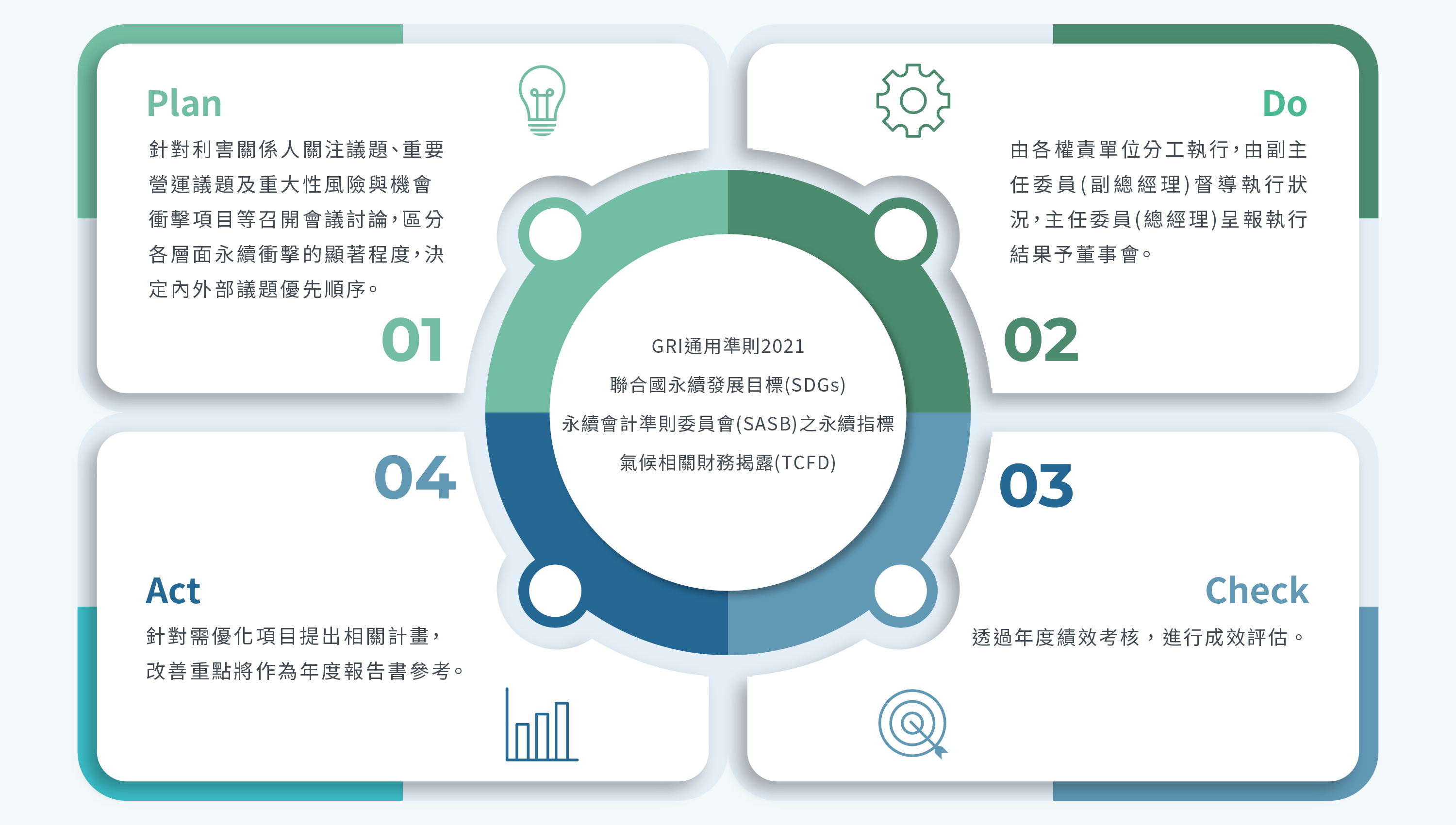 中運經董事會授權董事長,成立「ESG永續委員會」,由總經理擔任主任委員、副總經理擔任副主任委員、各權責單位一級主管擔任執行委員,透過各權責單位指定分派出: 永續環境小組、永續社會小組、永續治理小組及永續價值鏈小組等四個小組組員,並由管理處成立「永續報告彙編小組」,進行永續報告內容蒐集、彙整、編撰與出版。委員會依 GRI 通用準則(2021)鑑別與評估重大性主題,同時參照聯合國永續發展目標(Sustainable Development Goals, SDGs)、永續會計準則委員會(SASB) 之永續指標與氣候相關財務揭 露(TCFD) 等制定各項永續政策,並以PDCA循環管理持續優化改善永續企業短、中、長 期目標與方向。
